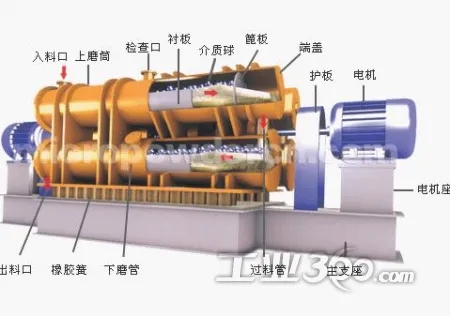 ZM系列振動(dòng)磨為雙圓筒結(jié)構(gòu)。由電動(dòng)機(jī)通過撓性聯(lián)軸器和萬向聯(lián)軸器帶動(dòng)激振器的軸旋轉(zhuǎn),激振器的軸上帶有偏心塊,由于帶偏心塊軸的旋轉(zhuǎn)使雙圓筒做近似的圓振動(dòng)。筒體內(nèi)充填研磨介質(zhì)(鋼球或鋼棒)和待粉磨物料,物料既可從上圓筒的進(jìn)料口進(jìn)入,上圓筒內(nèi)粉磨完畢的物料流入下圓筒繼續(xù)粉磨,后從下圓筒的出料口排出,即單進(jìn)單出;物料也可同時(shí)進(jìn)入上下圓筒進(jìn)行粉磨,然后同時(shí)排出,即雙進(jìn)雙出或雙進(jìn)四出。筒體做圓振動(dòng)時(shí),筒內(nèi)的介質(zhì)和物料在筒內(nèi)翻轉(zhuǎn),互相沖擊,這種有規(guī)律的翻轉(zhuǎn)、沖擊和介質(zhì)的自轉(zhuǎn),使物料在短時(shí)間內(nèi)得到粉碎,并達(dá)到理想的粉碎效果。