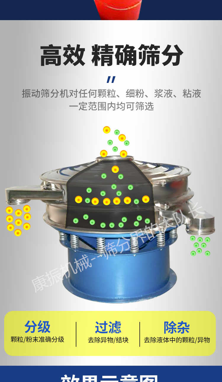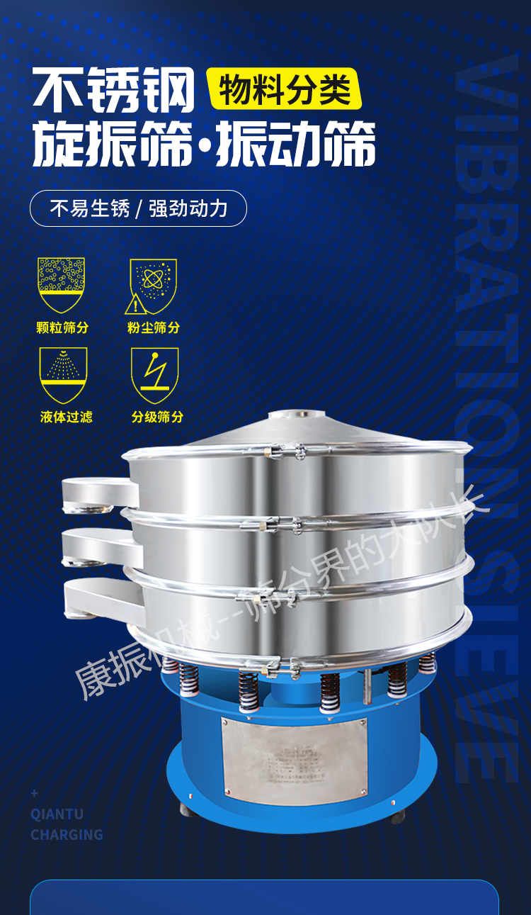 2、去液體:本設備單層、多層使用,可十分有效地處理固體、液體的混合物料??焖賹崿F(xiàn)固液分離,并篩選過濾出不同的目的物料。