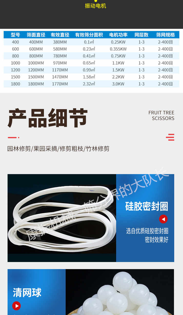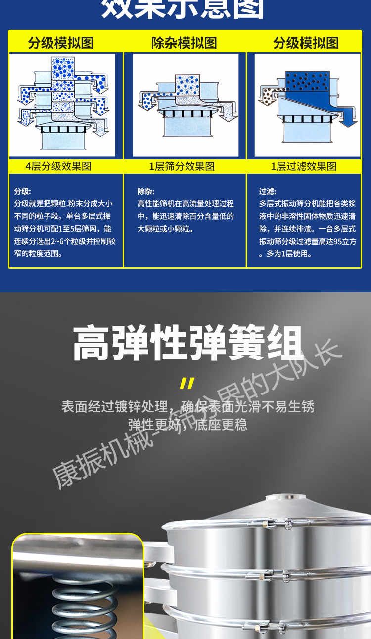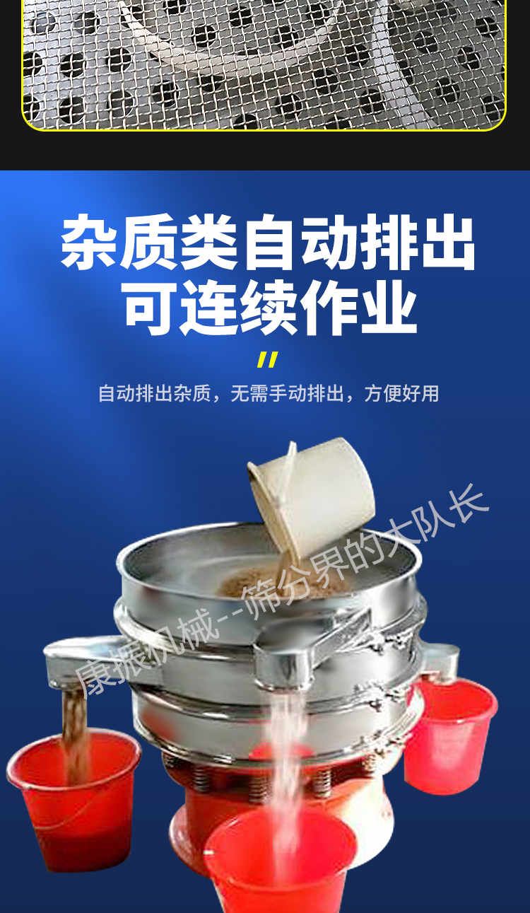 篩選范圍廣--只有系列三次元旋振篩能分選如此廣的原料范圍:任何顆粒、細粉、漿液都可以篩選。篩分細500目(28微米),過濾細5微米。網(wǎng)孔防堵塞--三次元振動功能及自動清理堵網(wǎng)裝置把堵網(wǎng)幾率降到小。 單層或多層分選--每臺旋振篩可選一至五層篩網(wǎng),能同時進行二到六個等級的分選或過濾。